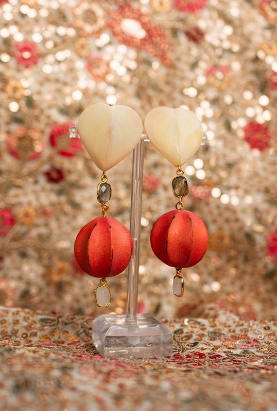 Pendientes super ligeros y con mucho movimiento. Montados sobre nácar, cuentas de madera de acacia tallada y charms de cuarzo, labradorita y piedra luna, con bisel de latón dorado y cierres de acero con presión de plata bañada en oro.
