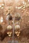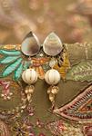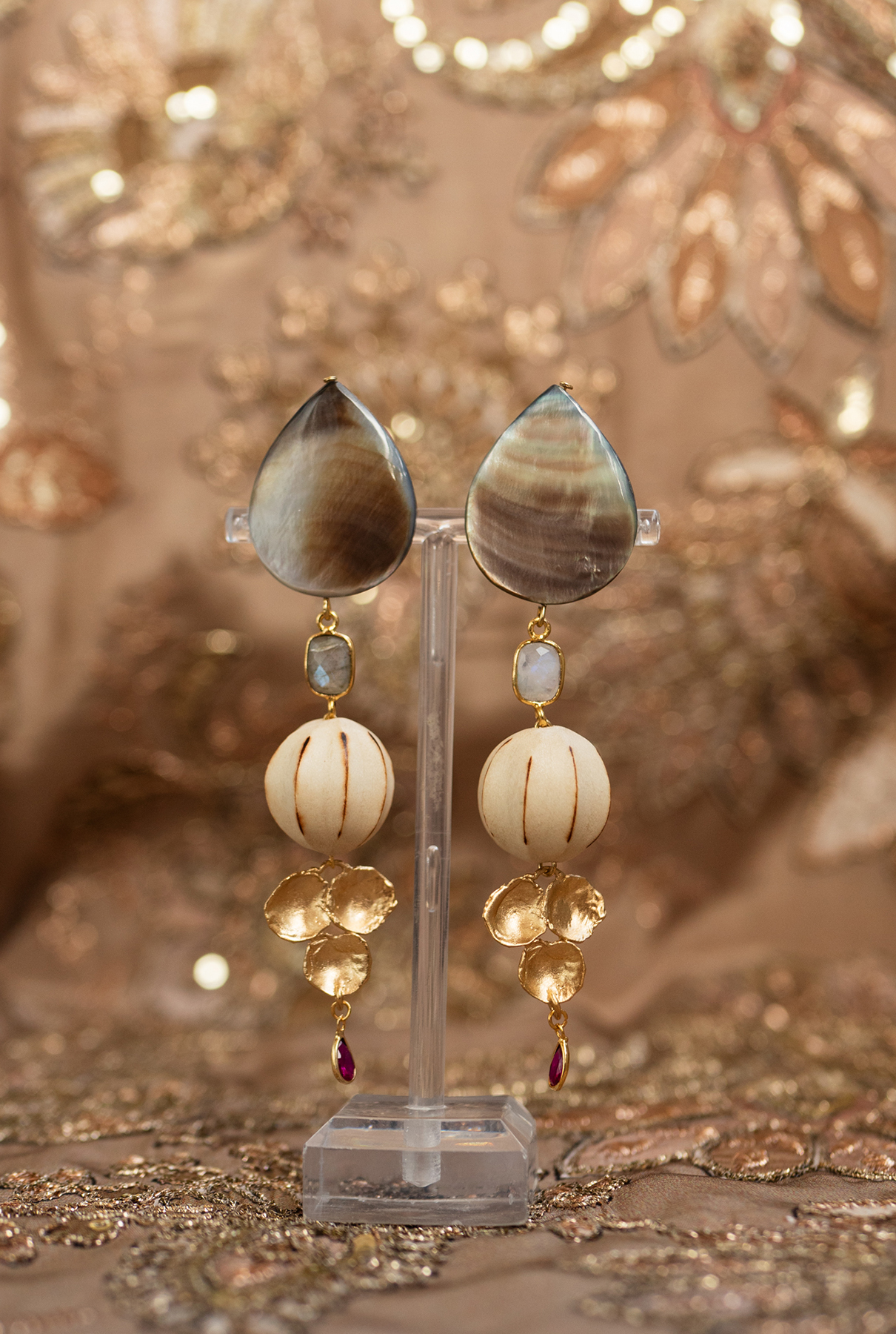 Pendientes super ligeros y con mucho movimiento. Montados sobre nácar, cuentas de madera de acacia tallada y charms de cuarzo, labradorita y piedra luna, con bisel de latón dorado y cierres de acero con presión de plata bañada en oro.