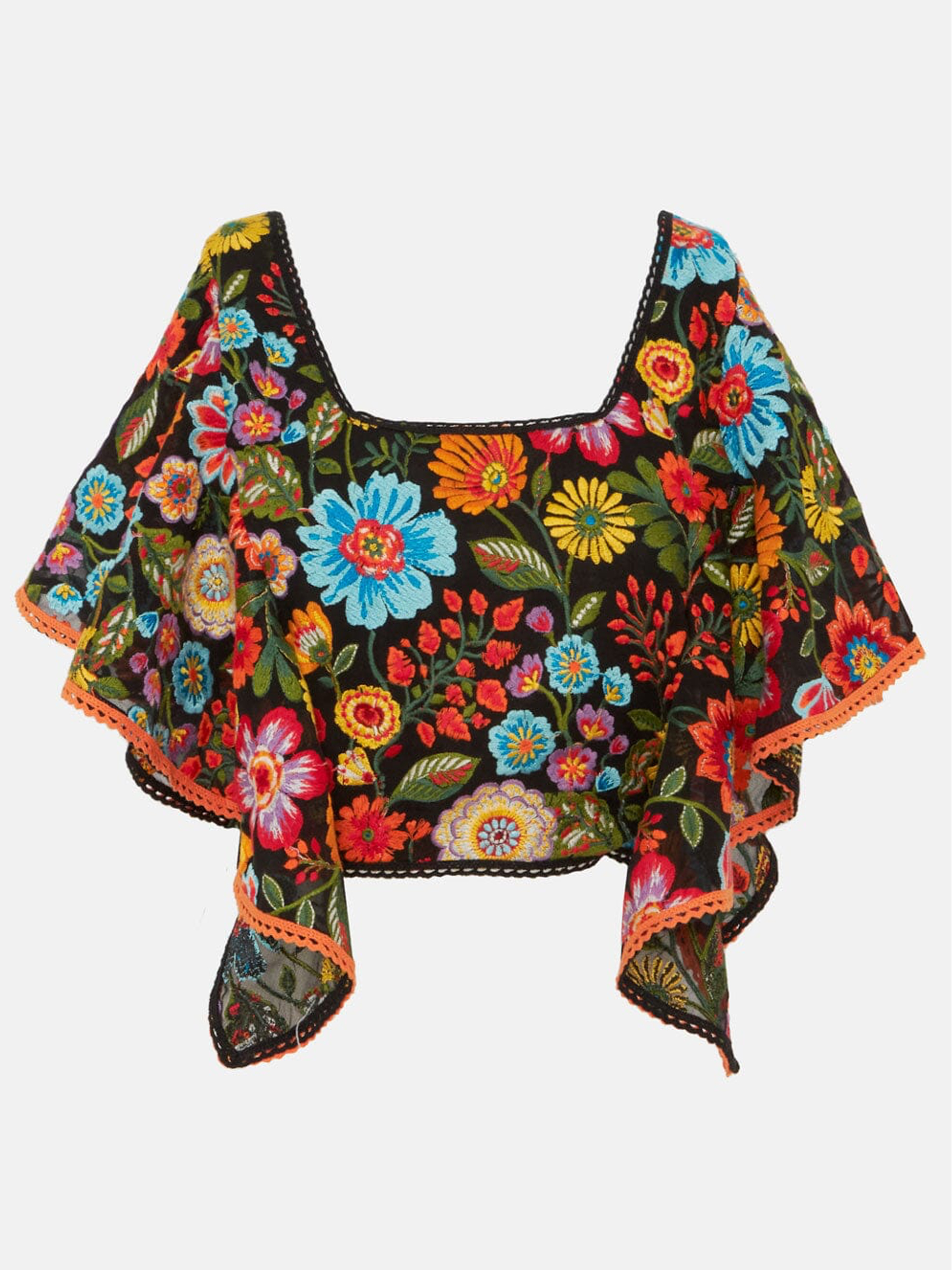 Este top de L.D está confeccionado en georgette bordado de flores con hilos de algodón en 12 colores que no deja indiferente. Diseño con escote recto y tirantes de volantes acabados en puntilla. Detalle de pasamanería en contraste. Cierre en trasera con cremallera oculta. Forro interior.