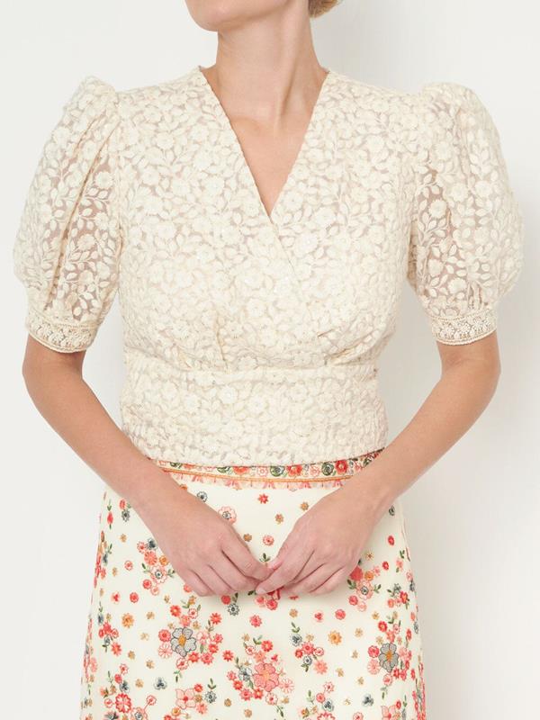 Romántico y femenino, el top "Nirav" es un diseño confeccionado en organza con un delicado bordado de flores al tono. Se trata de un diseño semitransparente con manga corta farol acabada en pasamanería y cuello en V. Cierre con lazada. Limpieza por especialistas.
