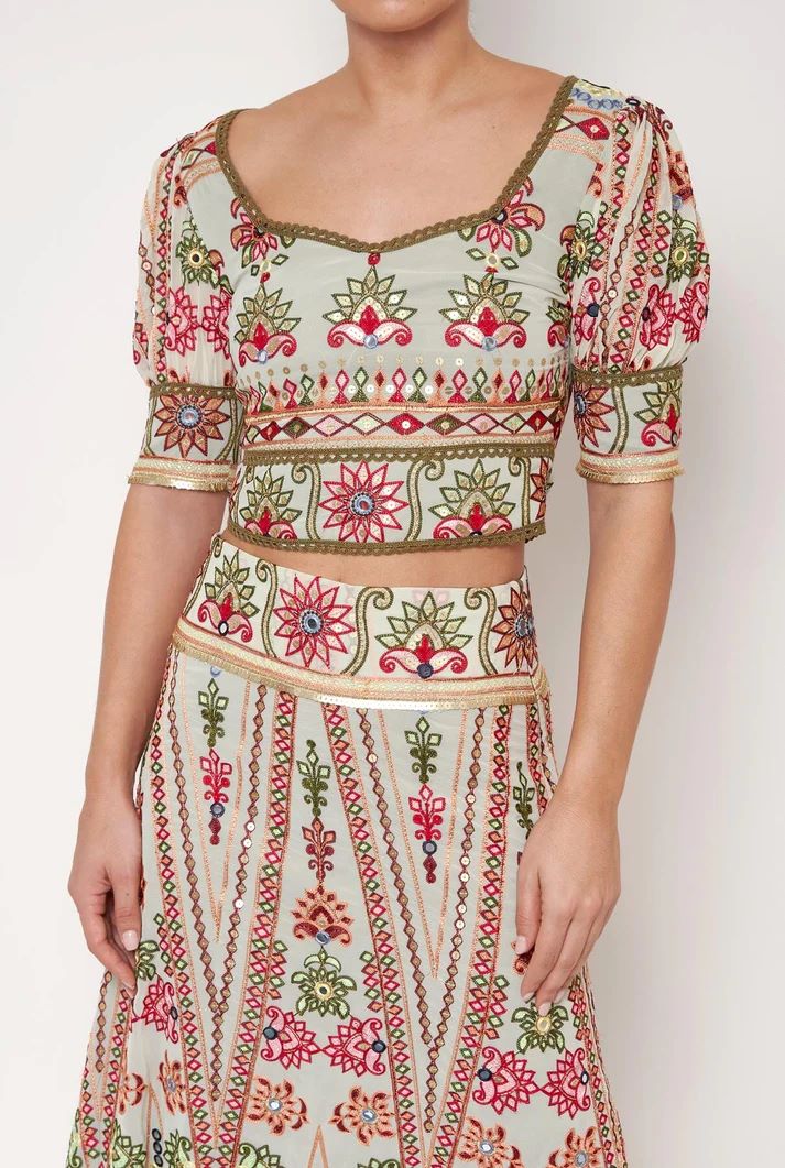 Es un diseño con escote semicuadrado y manga abullonada rematada en puño. Confeccionado en georgette bordado con espejos y detalles de ribetes en contraste. Cierre trasero con cremallera oculta en costura. Forro de raso verde.