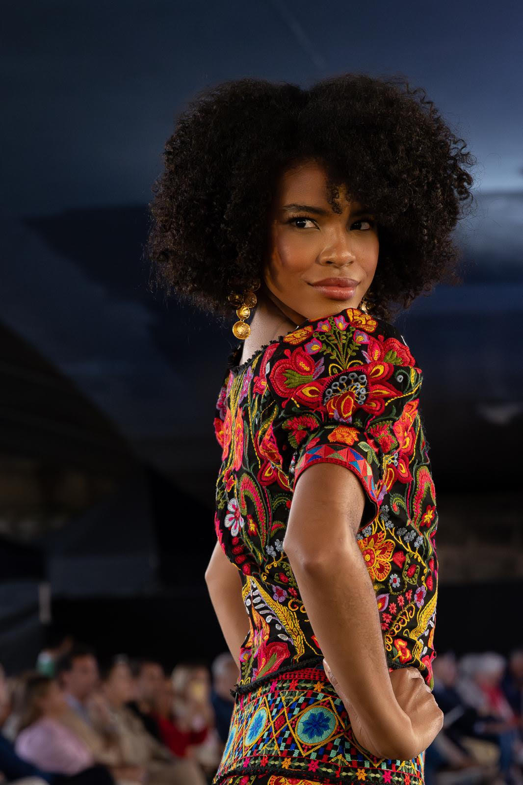 El diseño TULIPA está confeccionado en un original georgette bordado de flores con hilos de algodón con escote cuadrada y manga farol abullonada con puño. Cierre trasero con cremallera oculta en costura. Forrada.