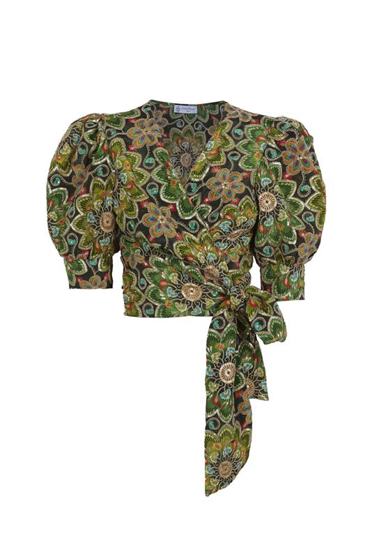 Top con escote en V y mangas farol abullonadas con puños. Cierre con lazo delantero. Detalle de tela con lentejuelas doradas. Forrado.