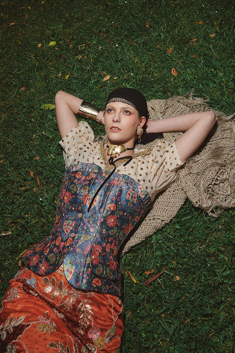 El corsé MARA está confeccionado en una seda estampada con motivos florales y bordados en hilo dorado con apliques de lentejuelas. Modelo de hombros descubiertos y cierre frontal con botones joya. Detalle de tapeta y ribete en escote. Forro satinado en contraste.