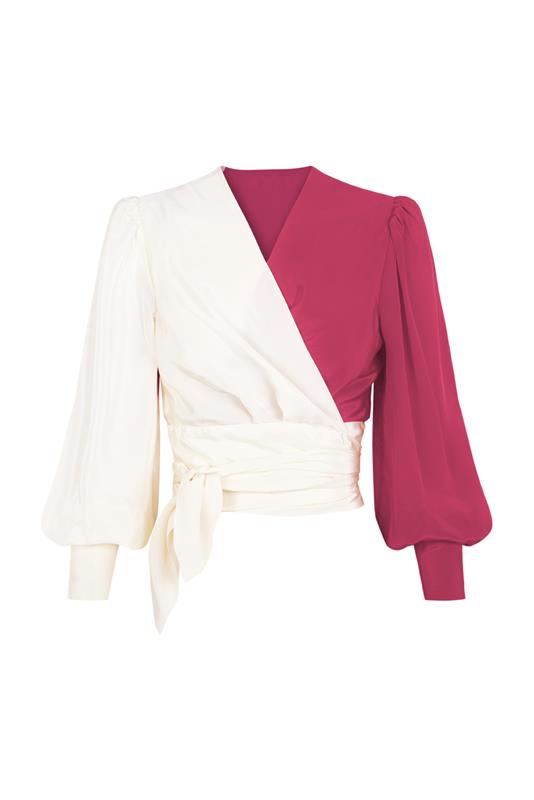 Camisa cruzada con escote pico y manga larga acabada en puño. Camisa confeccionada en un tejido combinado. Cierre frontal con lazada.