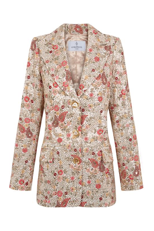La americana "Nieves" está confeccionada en una tela bordada en flores con hilo dorado. Bolsillos laterales con solapa y cierre delantero con botones. Forrada.