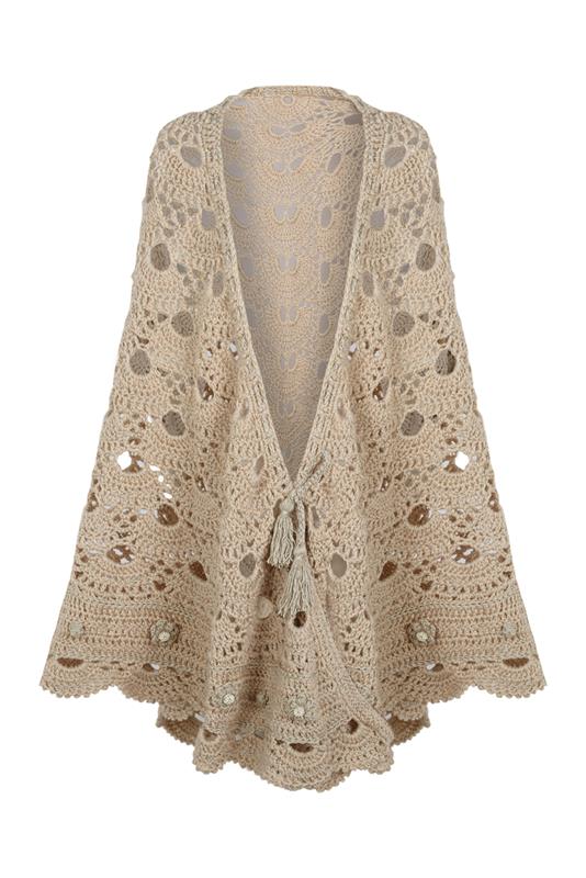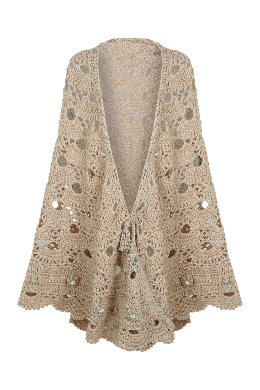 Amplio Chal triangular en mezcla de lana con hilaturas doradas, Hecho a Mano. Diseño acabado en ondas con dos borlas, que permiten un cierre frontal tipo capa. El Chal LALI es un complemento perfecto para dar un toque especial a cualquier conjunto.