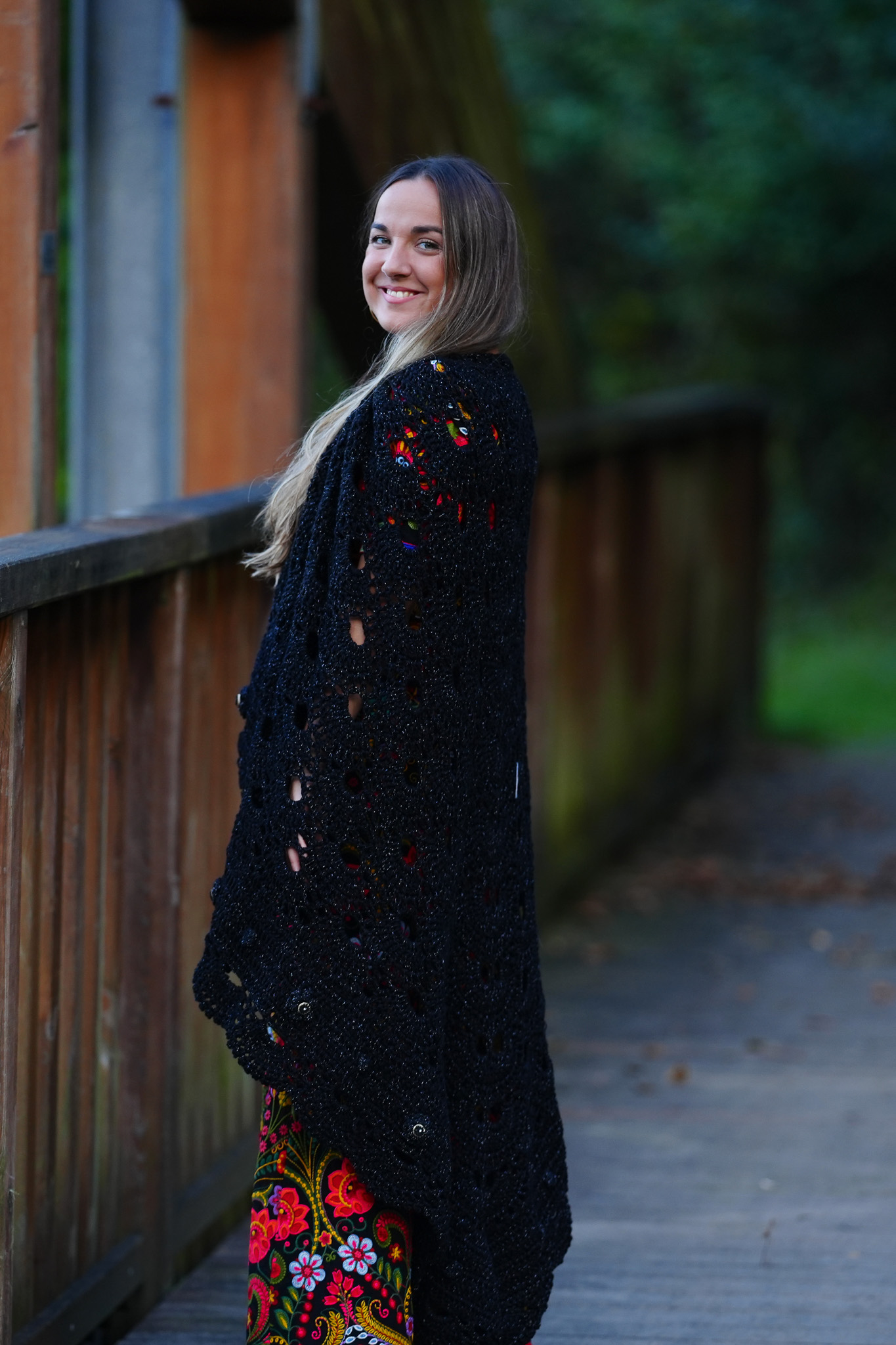 Amplio Chal triangular en mezcla de lana con hilaturas de plata, Hecho a Mano. Diseño acabado en ondas con dos borlas, que permiten un cierre frontal tipo capa. El Chal LALI es un complemento perfecto para dar un toque especial a cualquier conjunto.