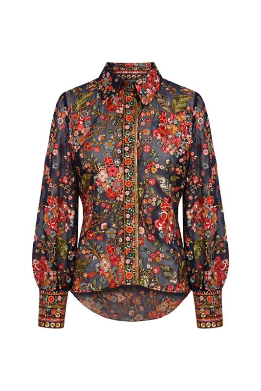 Camisa bordada de cuello solapa, manga larga acabada en puño. Cierre frontal con detalle de botones joya.
