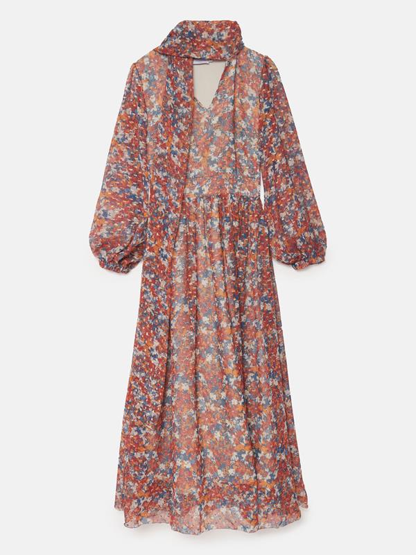 Fluid long dress in printed chiffon. Round neck with bow in the same fabric. V- neckline and long sleeves with elastic cuffs. Cut at the waist. linned