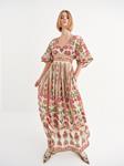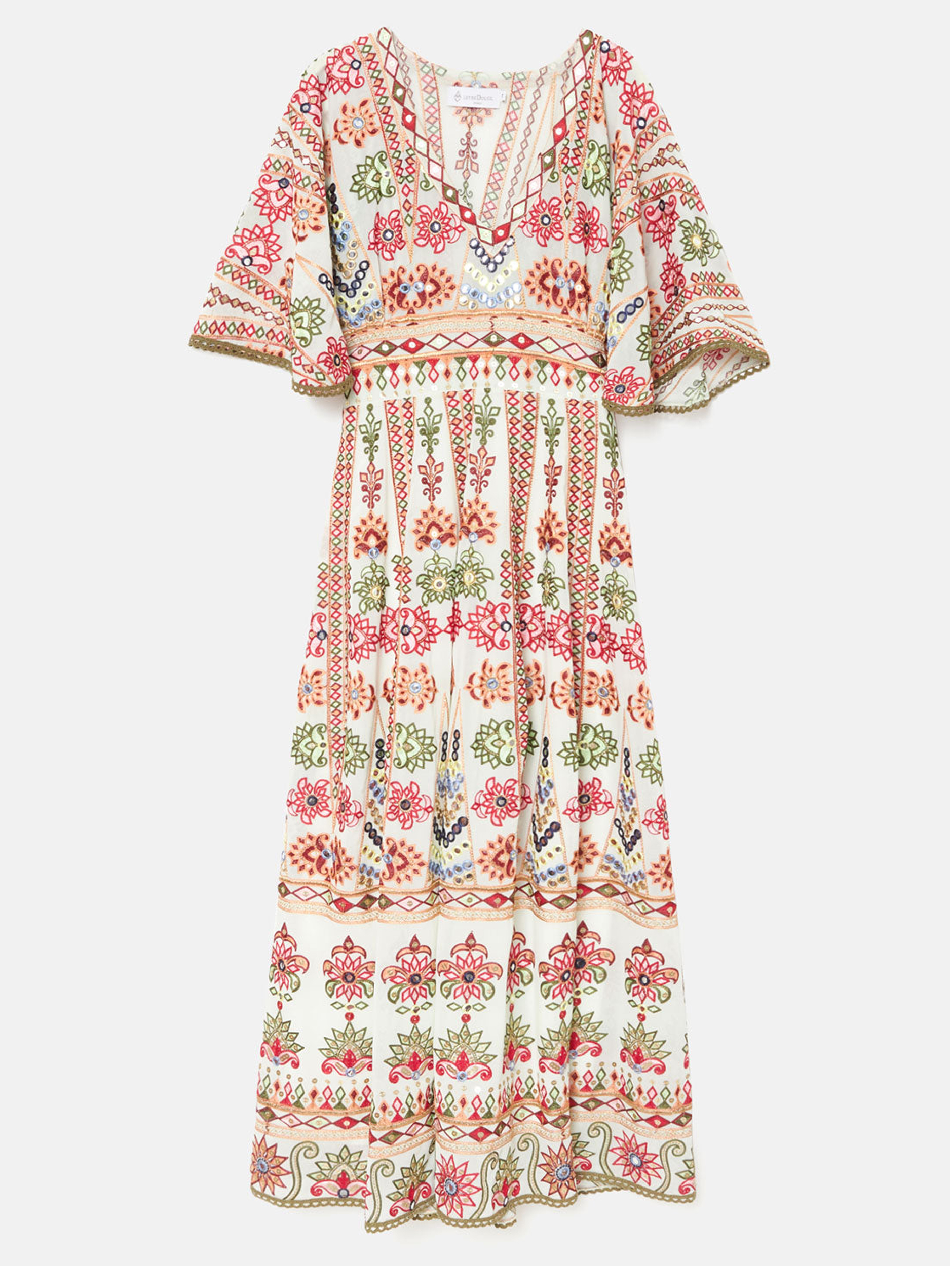 Long embroidered dress with V-neck. Waist elastic. Wide elbow sleeve with finished in trimimmings. Ruffled Hem. Lining.