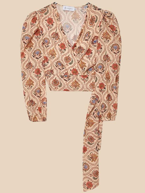 V-neck top featuring puff sleeves falling with elastic. Front tied fastening.