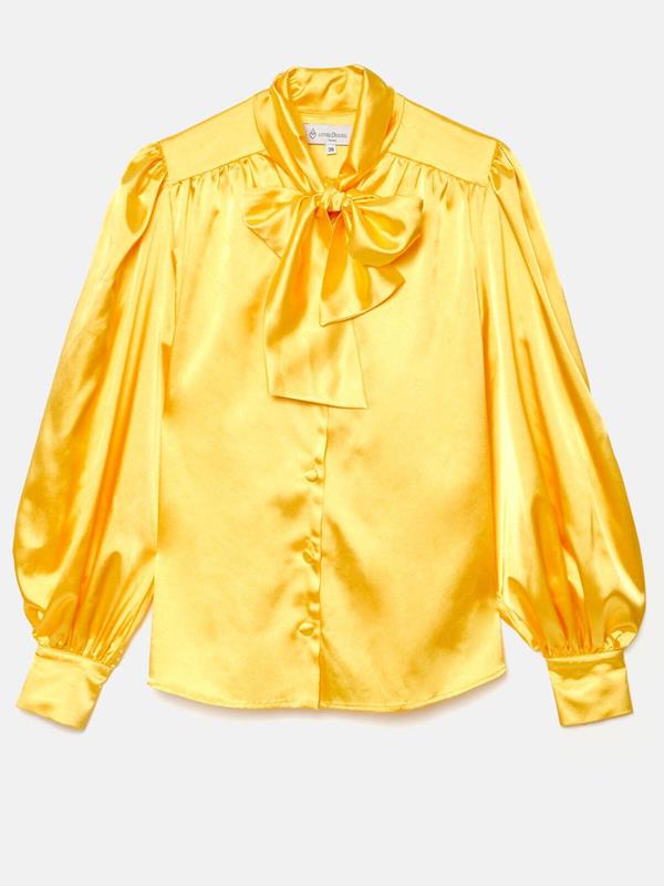 Elastic satin shirt with neck finished in bow. Long sleeves with volume finished in cuffs with buttons. Front closure with covered buttons.