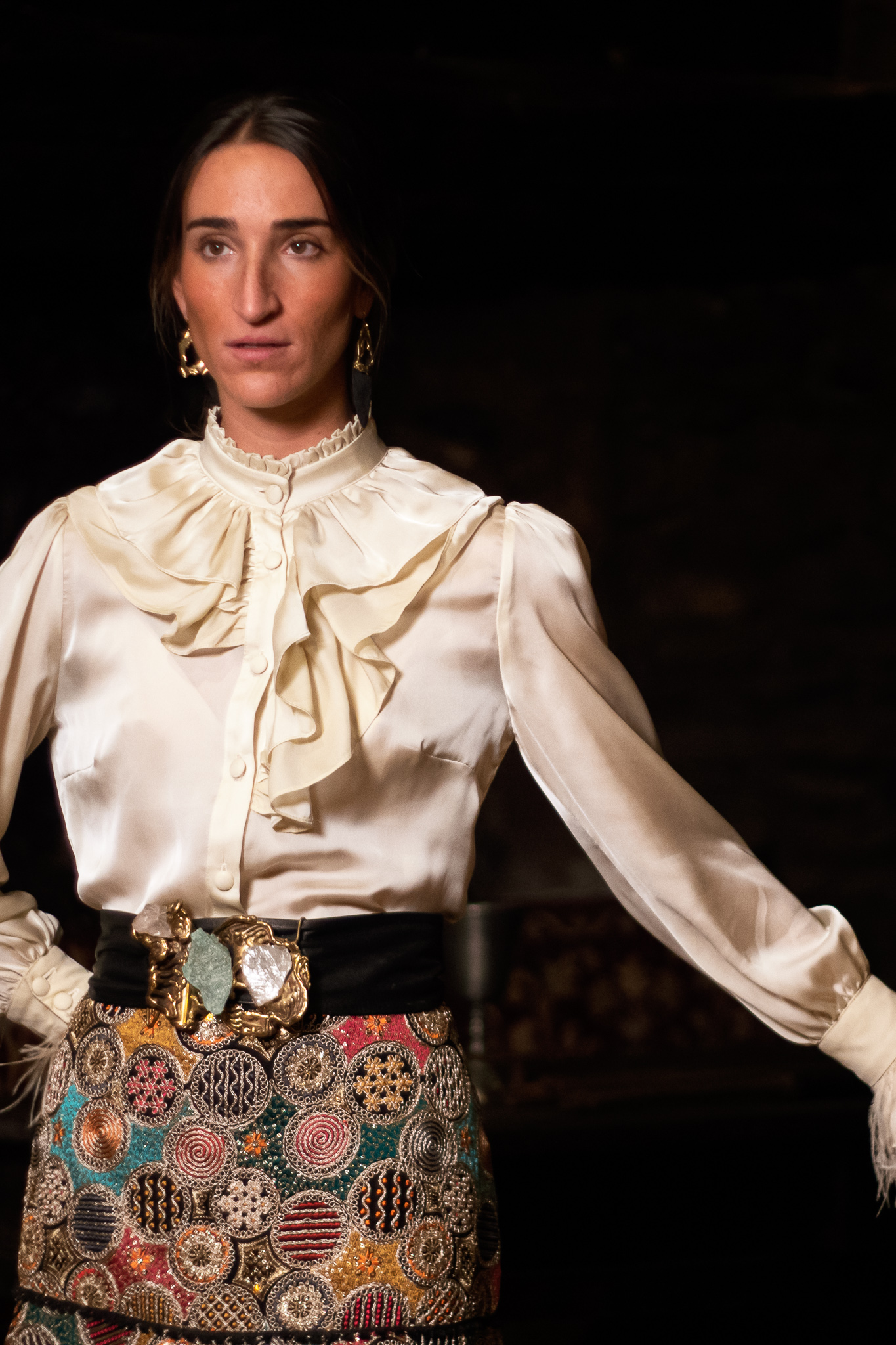 Mao collar and long sleeve model finished in cuff with feathers details.