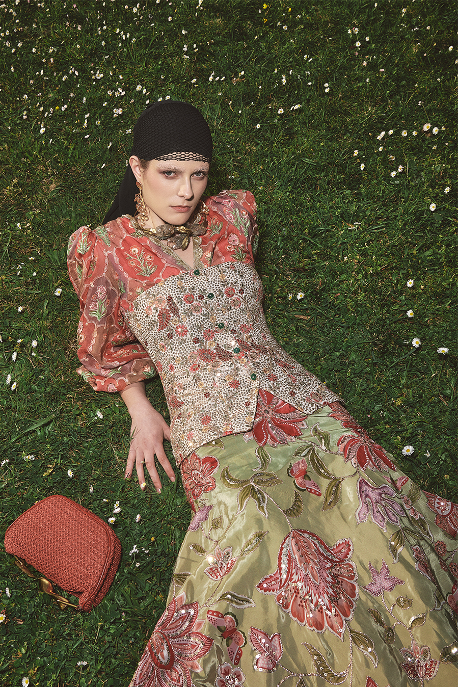 This LD design is made of a jewel fabric embroidered in flowers with gold thread. Model with bare shoulders and front closure with jewel buttons. Lined.