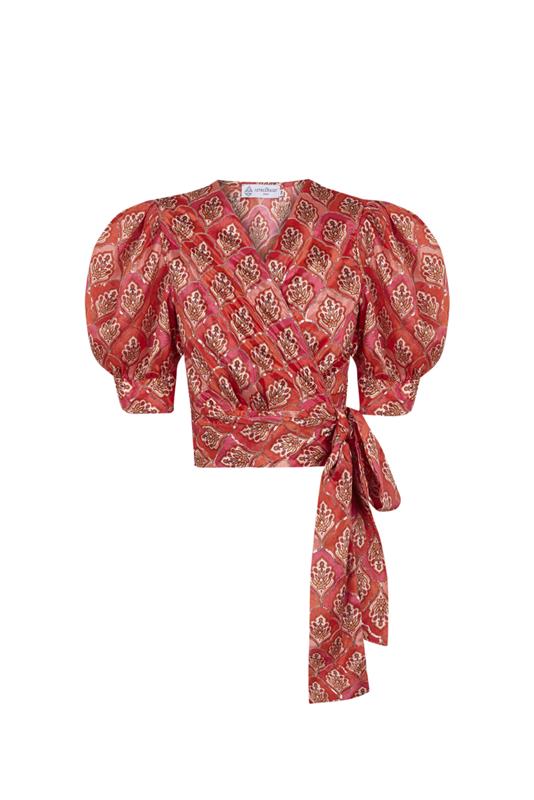 Top with V-neckline and puffed puff sleeves with cuffs. Front tie closure. Fabric detail with gold sequins. Lined