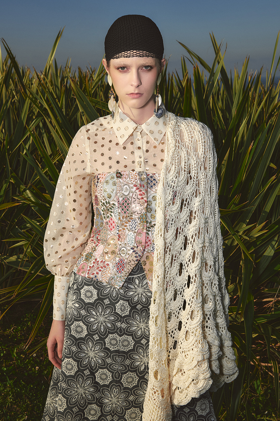 This LD design is crafted from an embroidered jewel fabric in shades of mauve, pink, gold, and blue. Off-the-shoulder styling and a front closure with jeweled buttons. With interior ties. Lined.