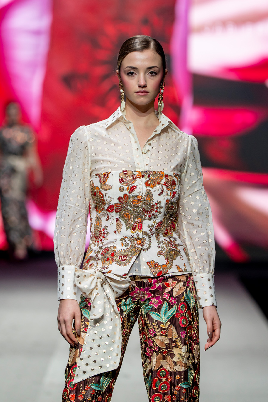 Crafted from silky, raw-blend georgette with a subtle satin sheen, this design features a predominance of floral and paisley motifs embroidered with metallic threads and tiny sequins that define contours and add texture, creating a luxurious and dimensional look. The dress has off-the-shoulder styl...