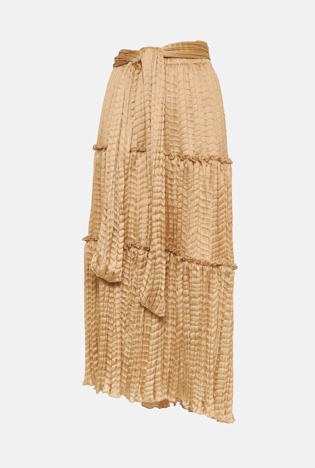 Long fluid skirt in wrinkled silk with an asymmetric hem finished in a ruffle. High waist with elastic and bow detail.
