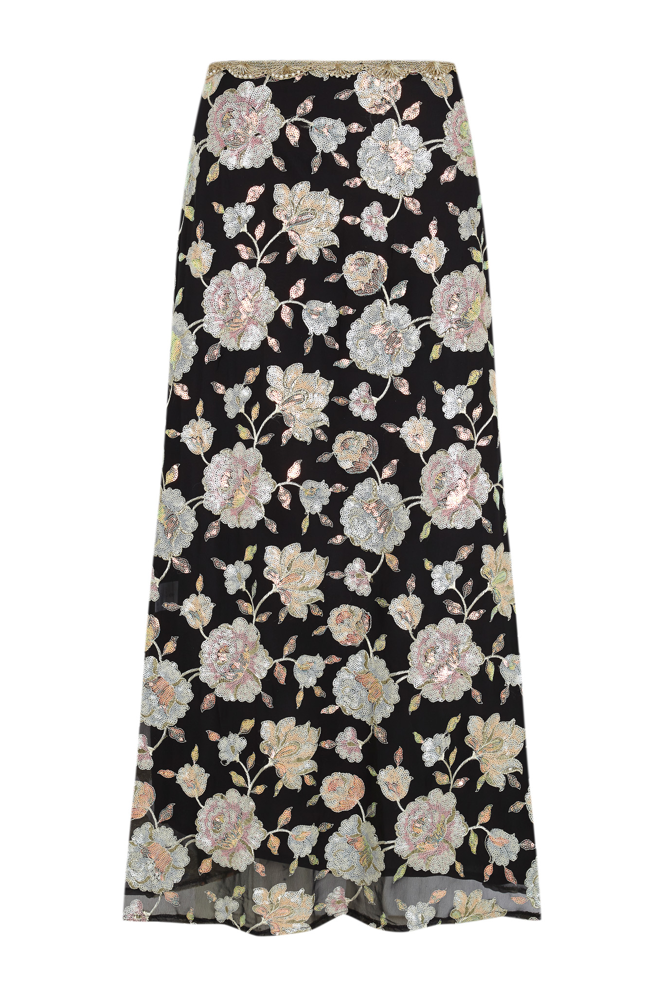 The ANAIS long skirt is made of an embroidered georgette with a floral print and sequin appliqués. High waist with gold trimming detail. Hidden zipper back closure. Lined.