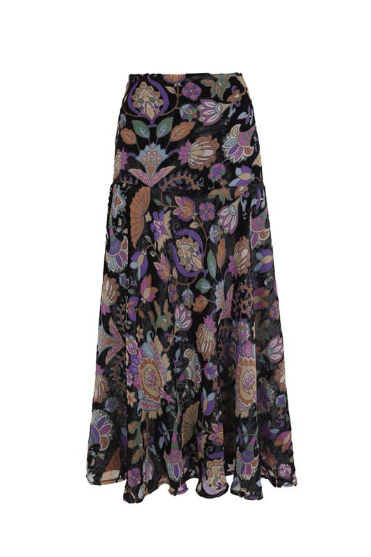 Long high-waisted skirt in burnt velvet printed with flowers. Hip cut and back closure with hidden in-seam zipper. Lined.