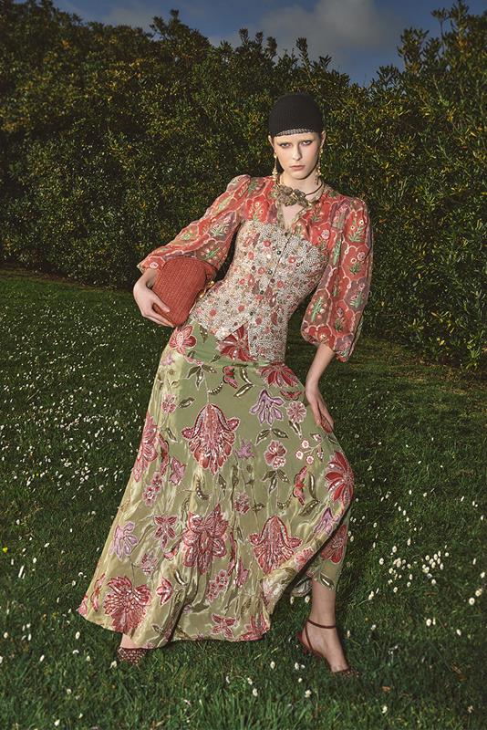 Long, high-waisted viscose skirt with delicate sequins and a floral print. Hip cut and back closure with hidden in-seam zipper.. Asymmetrical hem. Lined.
