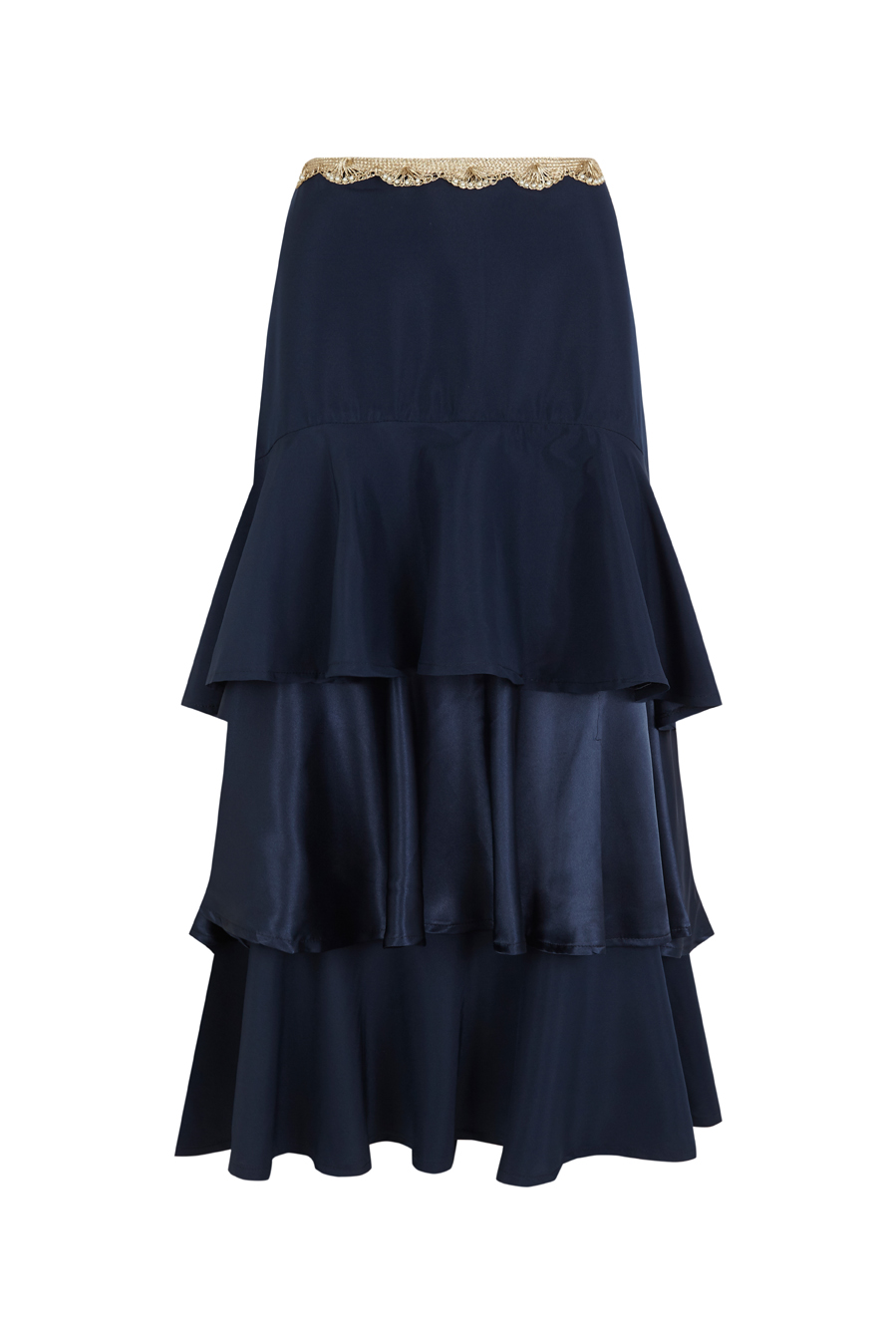 Long skirt with three asymmetrical ruffles crafted from a fluid fabric combining two shades of the same fabric. Cut at the hips and high-waisted with a trim detail at the waist. Back closure with a concealed zipper.