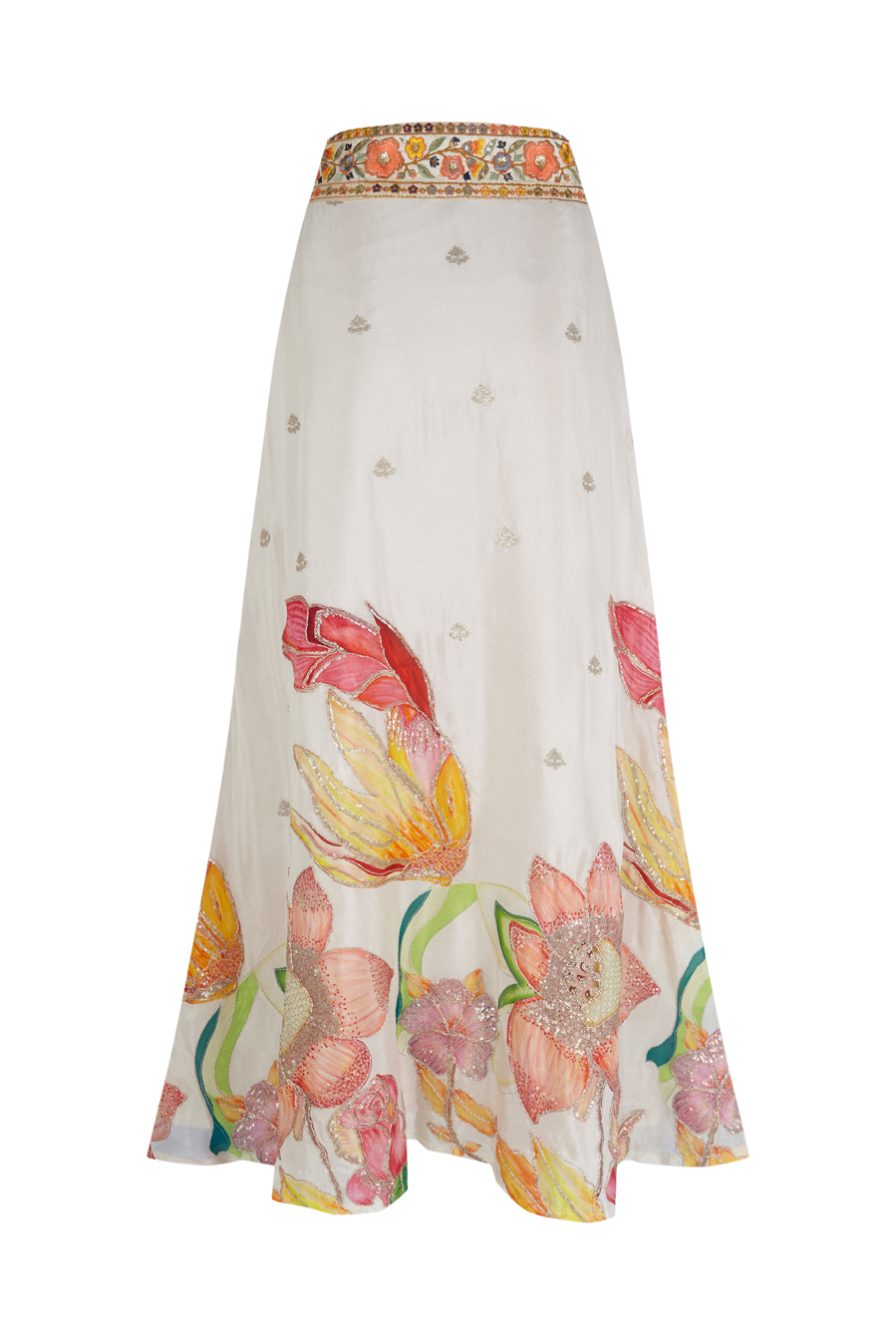The OLA skirt is made from a flowing fabric with a floral print and sequin appliqués. Trim detail at the waist. Side zipper closure concealed in the seam. Lined.