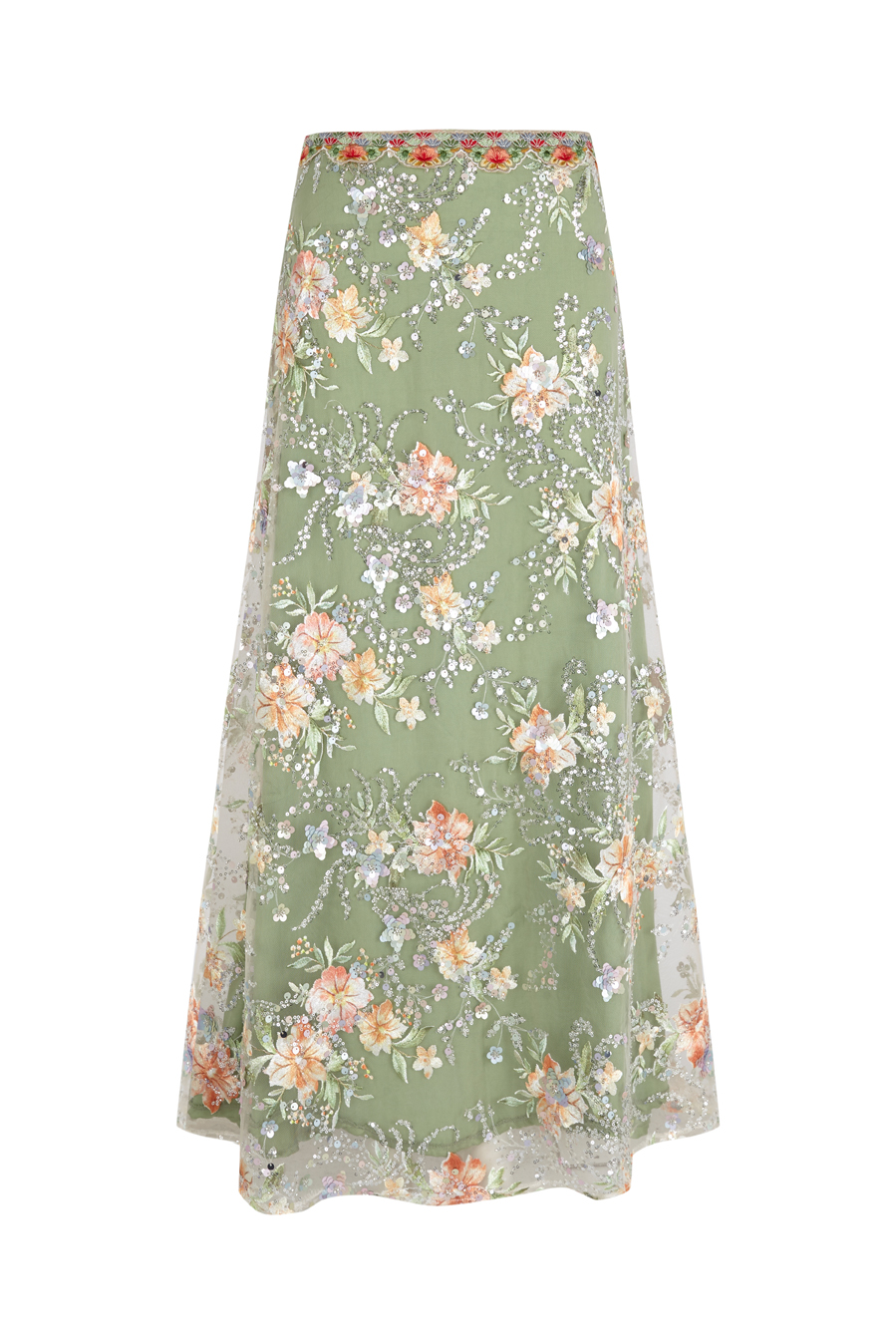 Hand-embroidered in warm autumn shades, with delicate sequins that catch the light. A high-waist silhouette adorned with floral details and a contrasting lining for that unexpected twist.