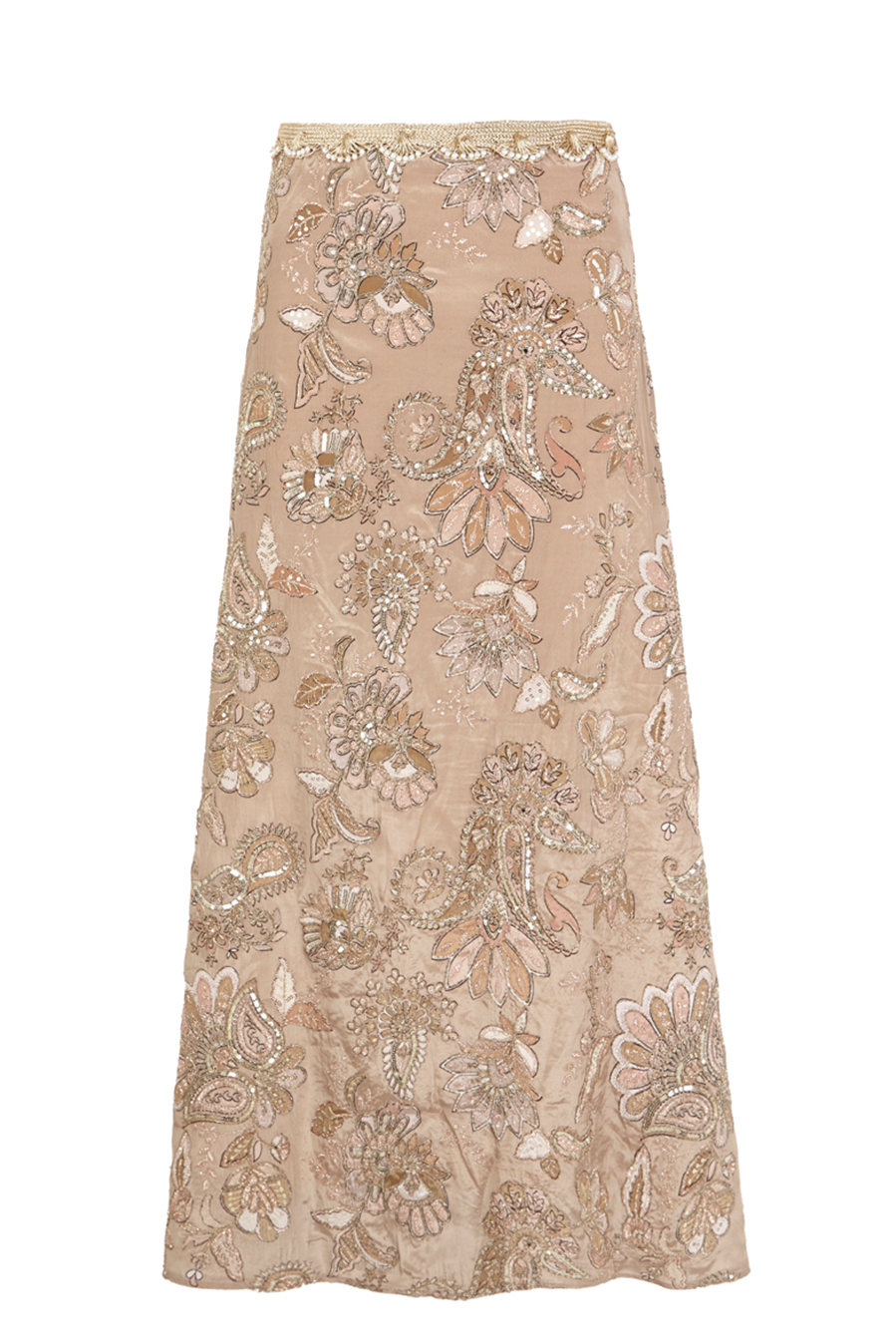 The DOLOMITA skirt is crafted from a silky, golden-beige georgette with a slightly satiny sheen. Floral and paisley motifs are predominant, embroidered with metallic threads and small sequins that outline contours and add texture, giving it a luxurious and dimensional look. High waist with metallic ...