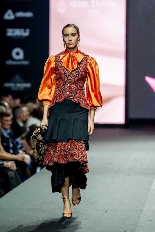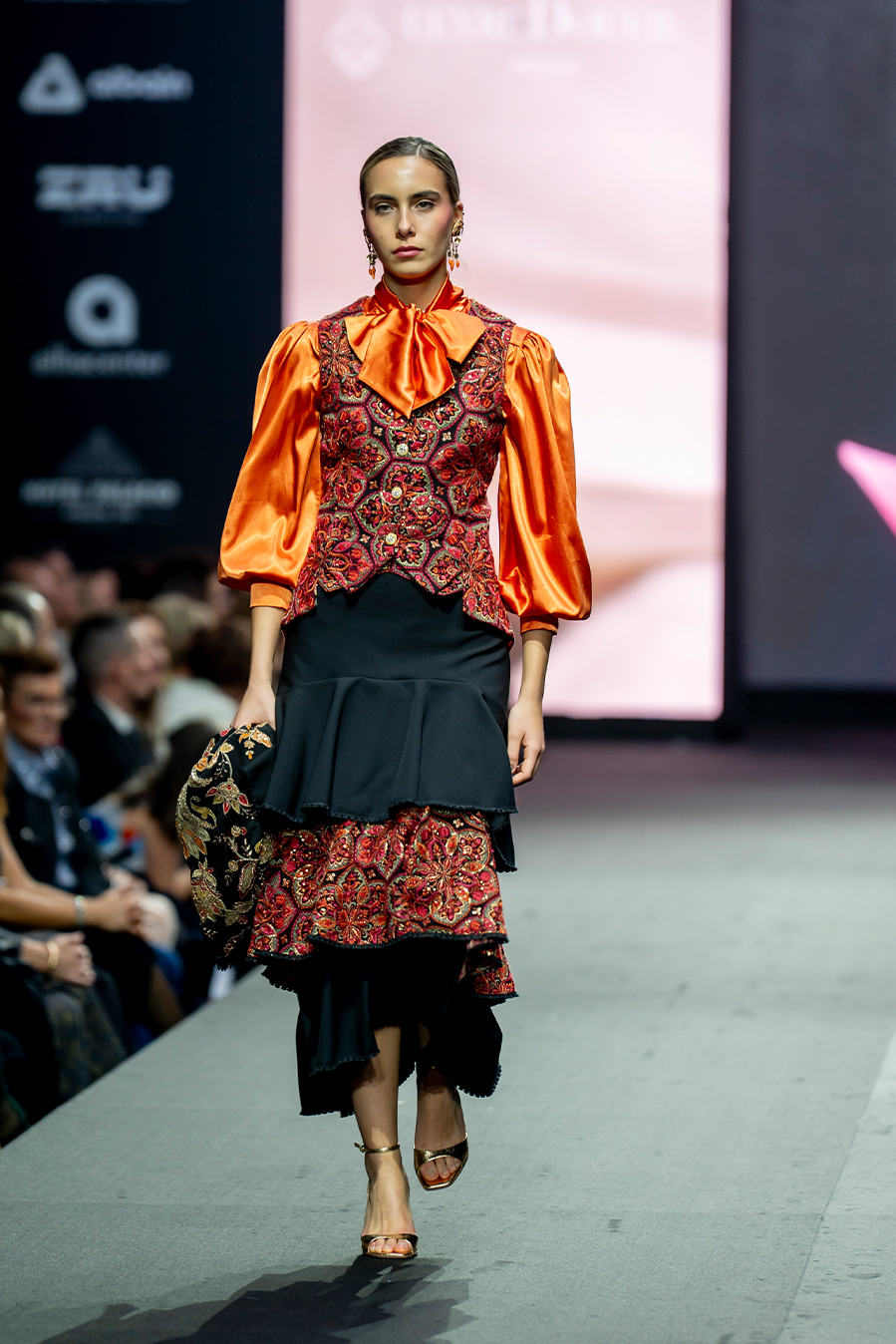 Long skirt with three asymmetrical ruffles, made from a stretch fabric and embroidered fabric in rust tones. Hip-hugging cut and high waist with trim detail at the waist. Concealed back zip fastening.