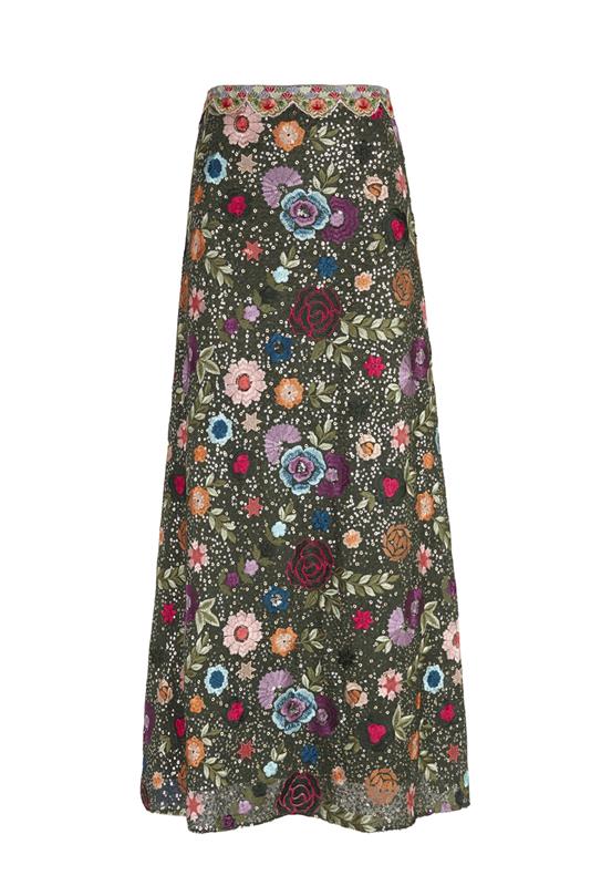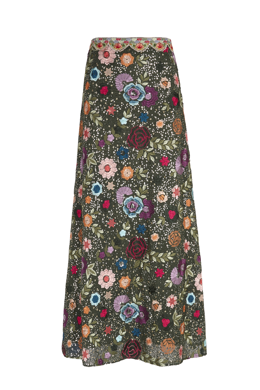 La falda larga ¨Maria¨esta confeccionada en georgette verde con delicado bordado floral y paillettes.