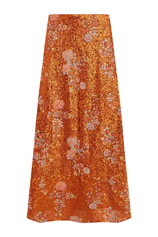 Apuesta por una elegancia atemporal eligiendo la falda larga "HELENA" en lentejuelas y con bordados florales. Perfecta para ocasiones especiales. De cintura alta y cierre con cremallera lateral oculta en costura. Forrada.