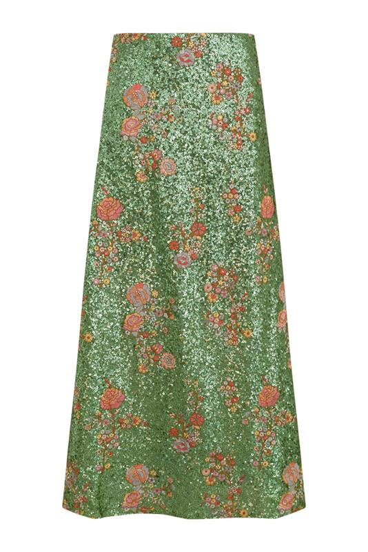 Apuesta por una elegancia atemporal eligiendo la falda larga "HELENA" en lentejuelas y con bordados florales. Perfecta para ocasiones especiales. De cintura alta y cierre con cremallera lateral oculta en costura. Forrada.