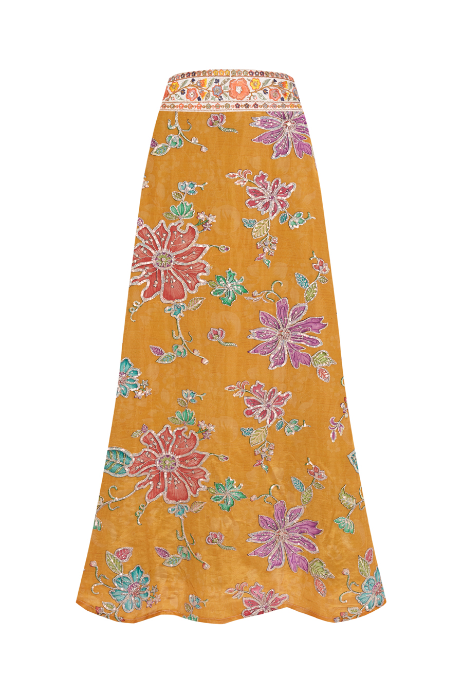 La Falda AMBAR está confeccionada en un georgette naranja con un original estampado floral en color turquesa y corales, bordada con hilos metálicos y apliques de lentejuelas. Cintura alta con detalle de pasamanería. Forrada.