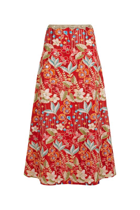 La falda SOFIA está confeccionada en georgette rojo con un favorecedor estampado floral bordado con hilos metálicos. Diseño de cintura alta con detalle de pasamanería. Forrada en contraste.