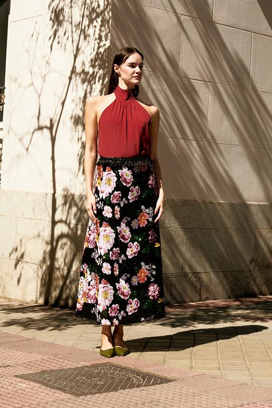 Apuesta por una elegancia atemporal eligiendo el modelo ONIX.Con un patrón floral bordado en lentejuelas y rocalla multicolor superpuesta sobre un fondo negro con un acabado deslumbrante que capta e irradia luz. Cintura alta rematada con pasamanería de flecos negros. Cierre lateral con cremallera oc...