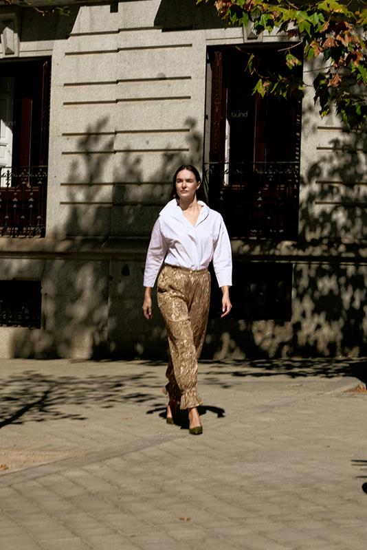 Sofisticado pantalón de tiro alto con bolsillos laterales y cierre frontal con cremallera y botón. Destaca la pernera ancha y abombada, ajustada con goma en tobillo y bajo acabado en volante. Confeccionado en un sedoso georgette verde oliva, ligeramente satinado. Predominan los motivos florales y de...