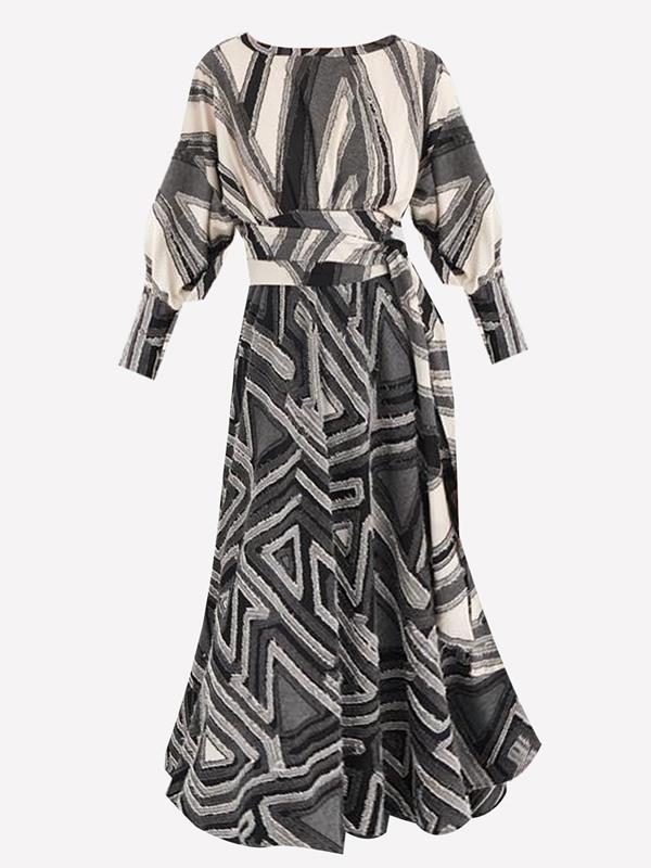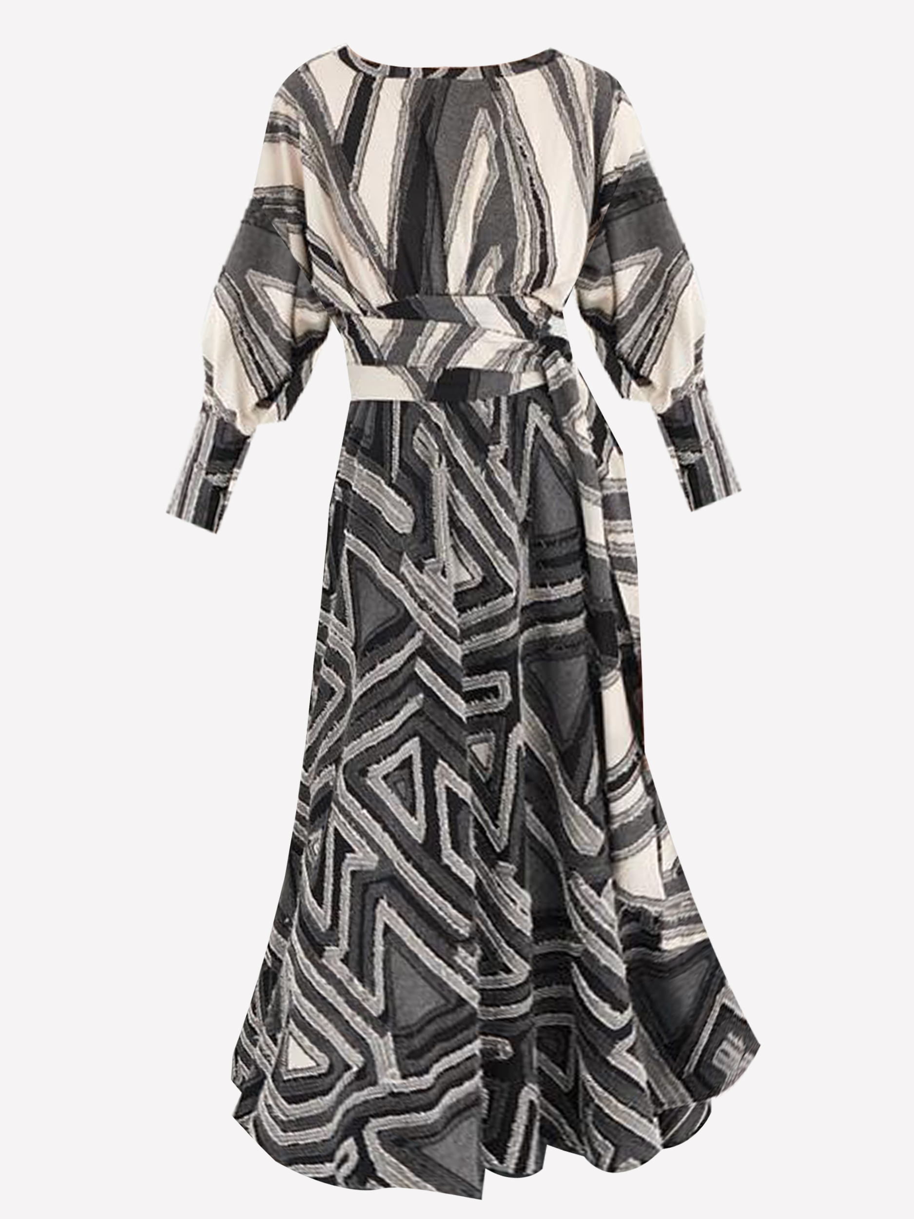 Vestido midi de cuello amplio y manga larga. Bajo asimétrico. Bolsillos laterales ocultos en costura. Corte en cintura con goma en trasera. Cinturón lazada en mismo tejido.